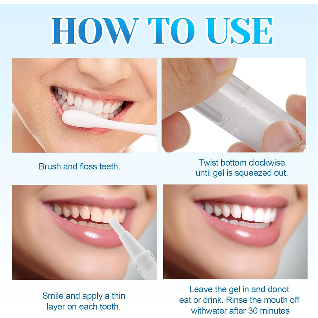 الاستخدام سهل جدًا، فقط قم بتدوير قاعدة القلم ليخرج الجل، ثم وزّعه مباشرة على الأسنان واتركه لبضع دقائق. يُنصح بالاستخدام مرة إلى مرتين يوميًا للحصول على أفضل النتائج.